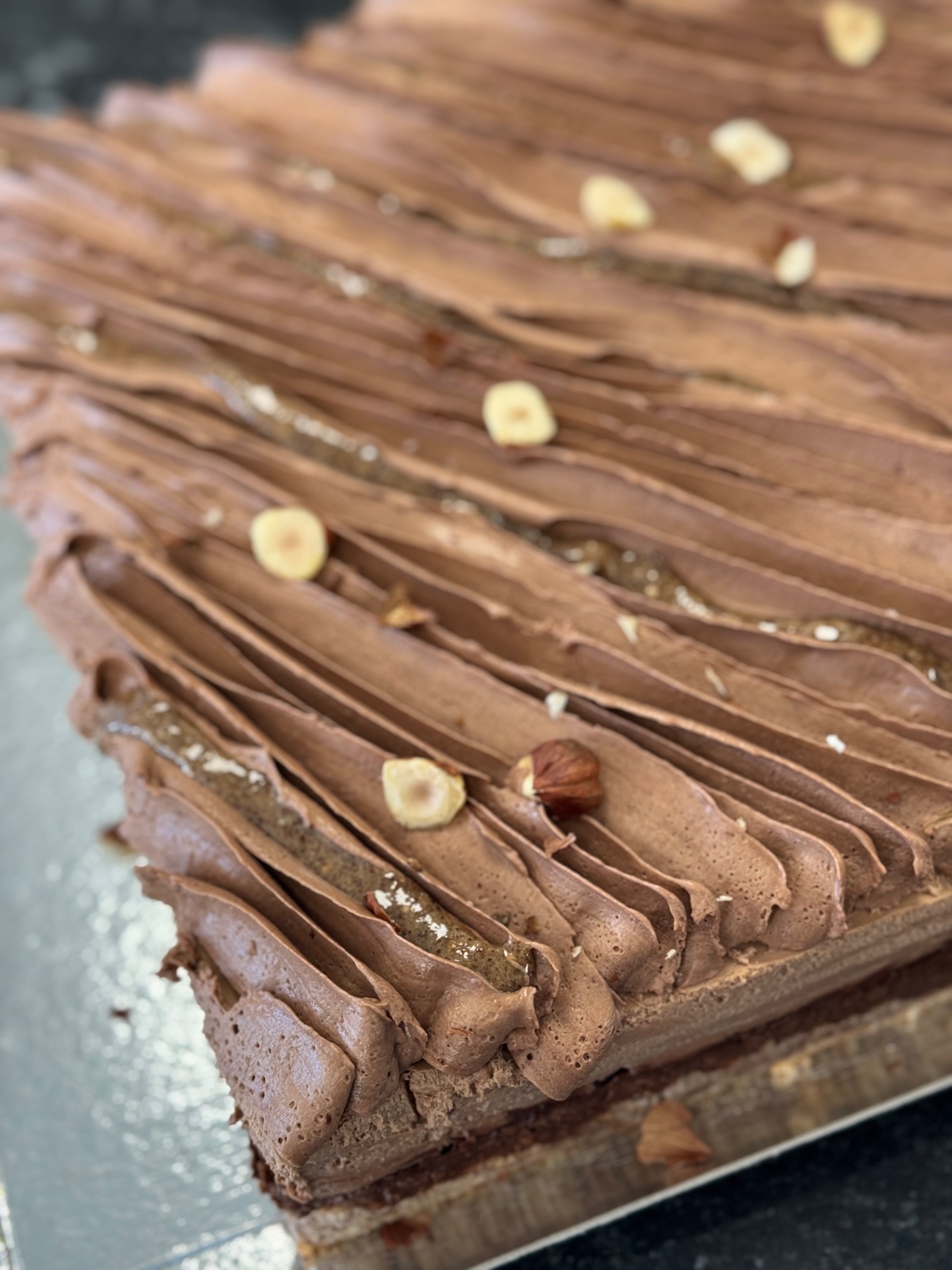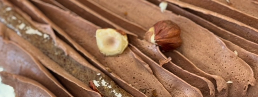 Mousse chocolat, cremeux noisette de cervioni, croustillant praliné, dacquoise noisette.